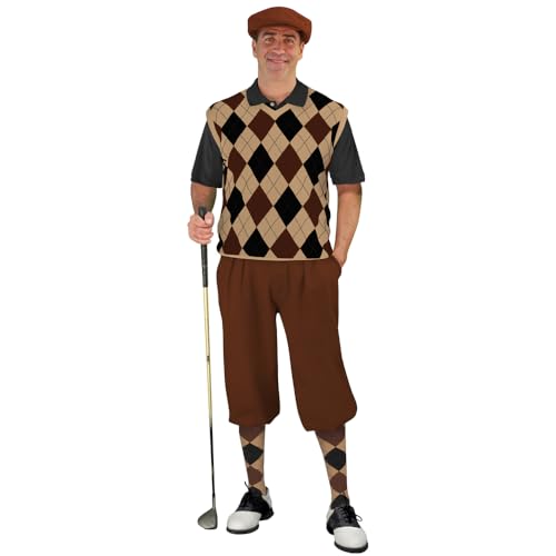 Mens Multi Style Golf Outfit – Matching Knickers and Cap – Two Over-The-Calf Golf Socks – Brown