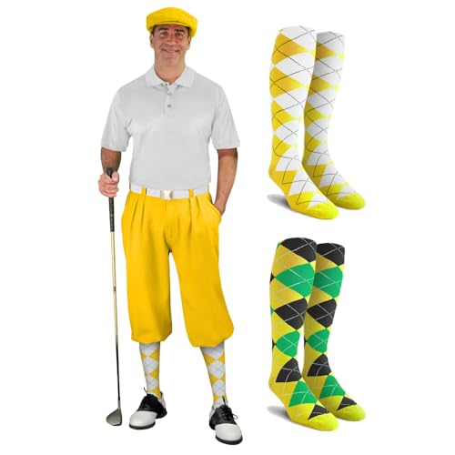 Mens Multi Style Golf Outfit – Matching Knickers and Cap – Two Over-The-Calf Golf Socks – Yellow – Size 60