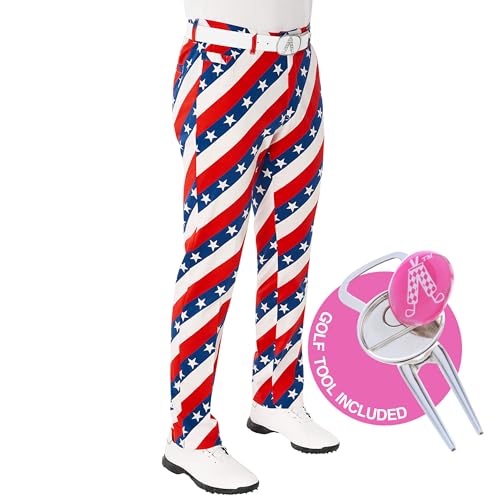 Royal & Awesome Pars and Stripes Golf Trousers for Men Slim Fit, Men’s Golf Trousers, Funky Golf Trousers, Tapered Mens Golf Trousers