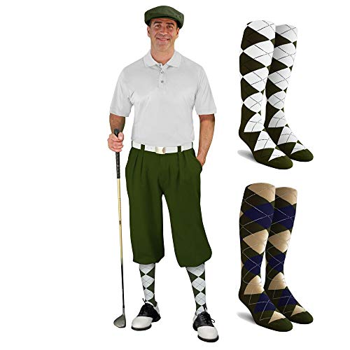 Mens Multi Style Olive Golf Outfit – Matching Knickers and Cap – Two Over-The-Calf Golf Socks